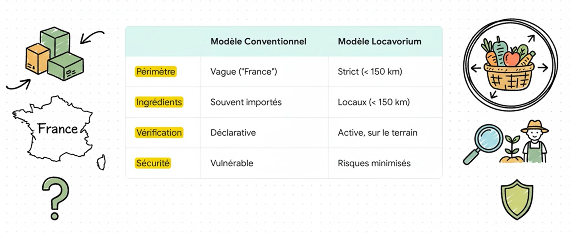 La complexité de la traçabilité ne se cache pas dans les produits bruts comme un fruit ou un légume, mais dans tout ce qui est transformé : sauces, biscuits, plats préparés, etc. C’est là que le flou est le plus profitable. Face à ce système, des contre-modèles radicaux émergent. Le Locavorium, par exemple, impose une définition sans ambiguïté : pour être vendu, un produit doit provenir de moins de 150 km, et cette règle s’applique non seulement à l’atelier de transformation, mais aussi à toutes les matières premières qui le composent. La différence de philosophie est saisissante, comme le montre cette comparaison :